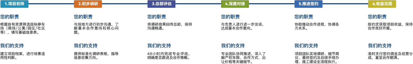 我们深知优质的合作关系建立在清晰、透明、高效的机制之上。为确保每一位合伙人的资源都能获得专业评估与价值最大化转化,我们建立了标准化的六步合作流程。从资源对接到持续收益,每一步都有明确的权责分工与时间节点,让您全程省心、安心。